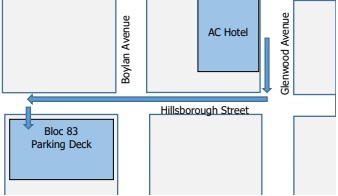 With your back to the hotel, turn right onto Glenwood Avenue. Go approximately 100 feet and turn right onto Hillsborough Street. Go approximately 1 block , crossing over Boylan Avenue and take a left into the Bloc 83 Parking Deck Entrance.